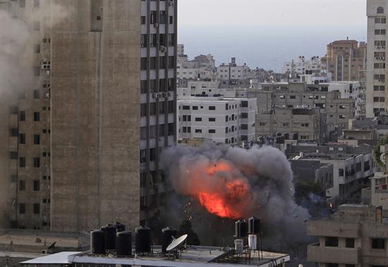 Bola de fogo emerge de prédio após ataque militar aéreo de Israel na Faixa de Gaza. Mais de 90 já foram mortos. (divulgação)