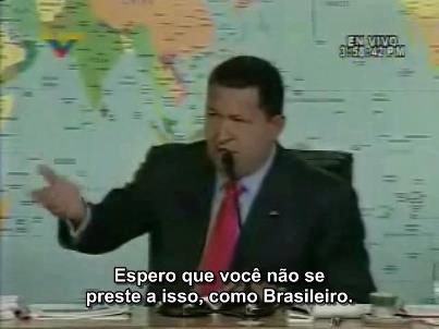 Chávez está dando uma coletiva, e um repórter ganha a palavra para uma pergunta. É um brasileiro, e trabalha na Globo. Fala num espanhol decente, e depois de se apresentar interroga Chávez sobre supostas agressões à liberdade de expressão.