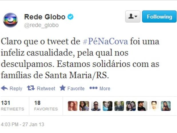 Após as críticas, o post foi deletado do perfil, e a Globo se retratou quanto à publicação: “Claro que o tuitede #PéNaCova foi uma infeliz casualidade, pela qual nos desculpamos. Estamos solidários com as famílias de Santa Maria/RS”, dizia a mensagem.