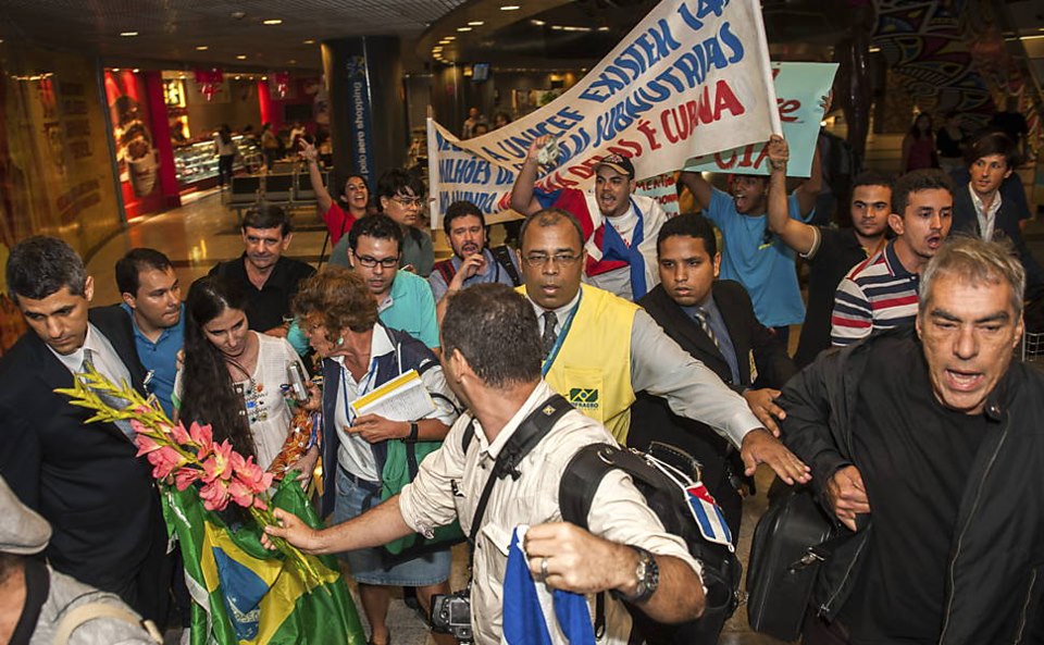 Blogueira Yoani Sánchez desembarca no Brasil sob protestos. À direita na imagem, vestindo preto, Demétrio Magnoli, integrante do Instituto Millenium, financiado pelos grandes grupos de comunicação do Brasil, recebe a opositora cubana. (Foto: FolhaPress)