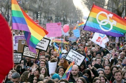 A extensão dos direitos civis para casais homossexuais reestabeleceu a linha de fratura entre direita e esquerda que as políticas econômicas liberais tinham apagado. Há hoje na França uma verdadeira guerra entre os dois setores. (Foto: Manifestação a favor do casamento da adoção para casais gays na França)