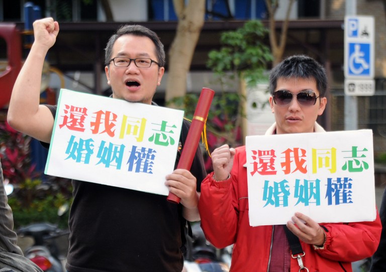 Chen Ching-hsueh e seu parceiro, Kao Chih-wei, mostram cartaz com a inscrição “devolvam meu direito de casamento”. Eles foram ameaçados de morte após tornarem pública a luta para se casarem em Taiwan. Foto: Sam Yeh / AFP