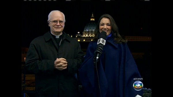 Dom Odilo Scherer e Patrícia Poeta durante cobertura do Jornal Nacional que tratou da escolha do novo papa (Foto: Reprodução)