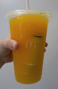 Era sexta-feira, 10 de maio. Duas pessoas saíram na hora do almoço para comprar lanches no McDonald’s para toda a equipe. De repente, depois de uns dois goles do suco de laranja, Camila — que prefere não ser identificada pelo sobrenome — nota algo preto boiando na bebida. Abriu a tampa e olhou com mais cuidado: uma peça plástica, tipo um cano, com um parafuso dentro, de cerca de 15 centímetros, disputava espaço dentro do copo plástico transparente com o suco.