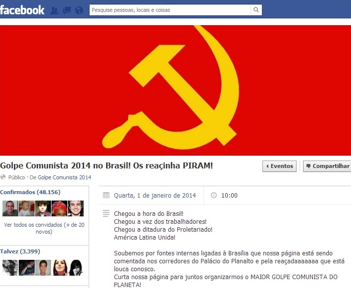 Criada para satirizar o temor de determinados setores conservadores da sociedade, segundo os quais o Brasil estaria à beira de uma ditadura comunista, o evento “Golpe Comunista 2014 no Brasil” passou hoje de 48 mil pessoas com “presença confirmada” no Facebook.