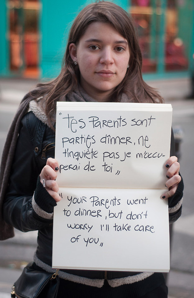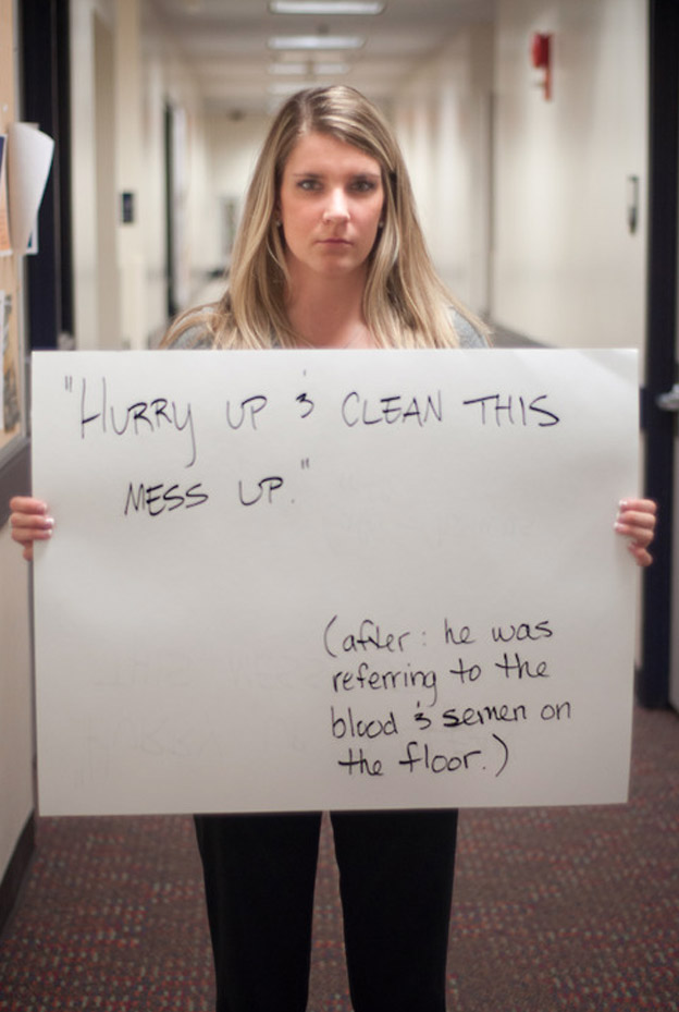 Projeto amplia o olhar para uma realidade cruel vivida por mulheres em todas as partes do mundo. Vítimas de abusos sexuais são fotografadas segurando frases ditas pelo violentador antes, durante ou depois do estupro