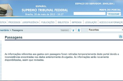 O site oficial do Supremo Tribunal Federal retirou do ar as informações referentes aos gastos da corte com passagens aéreas. A medida foi tomada após a descoberta, pelo jornal O Estado de S.Paulo, de que o Supremo gastou 608 mil reais com viagens das mulheres dos ministros do STF que acompanhavam os maridos entre 2009 e 2012.