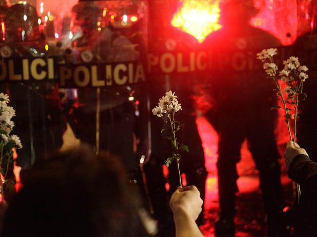 Manifestantes mostram flores para Tropa de Choque durante confronto na última terça-feira (Foto: Gabriela Biló / Futura Press)