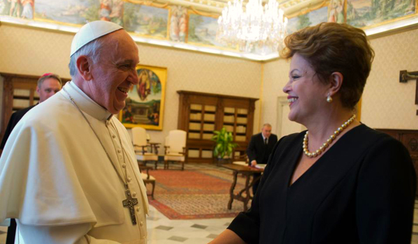 Dilma durante encontro com o Papa Francisco: a presidente declarou-se sem religião em 2007, mas durante a campanha que a levou à presidência em 2010 garantiu que era, “em primeiro lugar, cristã” (Divulgação)