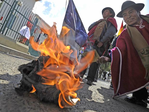 Bolivianos queimam bandeira da França em frente à embaixada do país, em La Paz. O governo francês impediu Evo Morales de sobrevoar seu território (Foto: AFP)