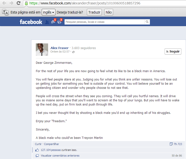 Entre as muitas manifestações que ganharam as ruas estadunidenses e inundaram as redes sociais, ganhou destaque a de Alex Fraser, um cidadã0 afroamericano, que publicou uma carta dirigida a Zimmerman em sua conta no Facebook, na que denuncia o que significa ser negro nos Estados Unidos.