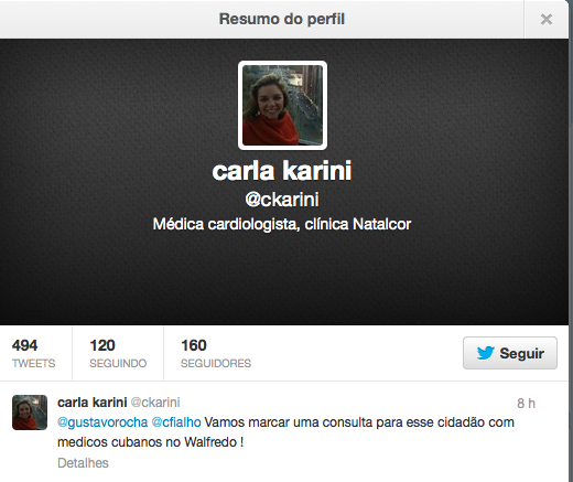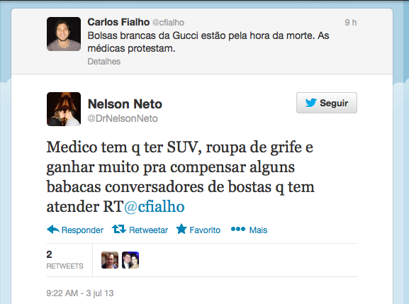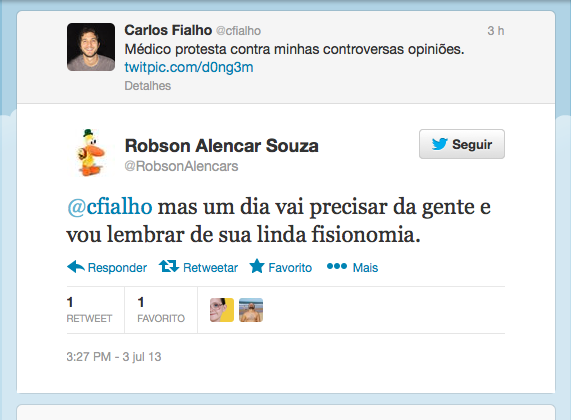 E pensar que mais cedo houve quem questionasse porque a #RevoltadoBusao não estava apoiando o protestos dos médicos. Falei, por mim, que não iria às ruas defender ideias das quais não comungo, como no que diz respeito à importação de profissionais. A postura desses médicos comprova que eu tinha razão. Vou registrar seus nomes para que, enquanto possível, nunca os procure.