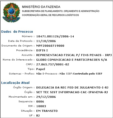 De qualquer forma, nos consideramos parcialmente satisfeitos por saber que a Globo admitiu a sua estrepolia. A Receita concluiu que houve uma gravíssima e comprovada fraude tributária e aplicou multa à empresa. O que está em aberto é se a Globo pagou ou não. A Globo diz que sim, mas minha fonte diz que não. Se pagou, diz ela, porque o processo consta ainda “em trânsito”?