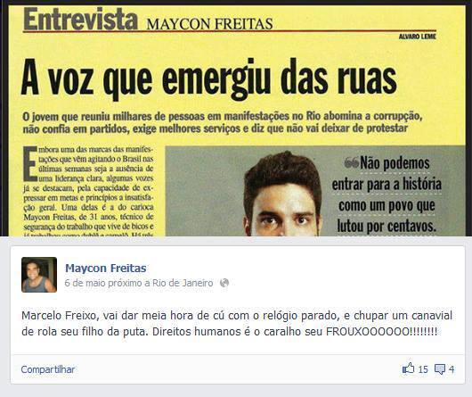 A Veja, é claro, nem se importou que Maycon tenha quase o dobro da idade da maioria dos manifestantes, mas o transformou num grande ativista cibernético.