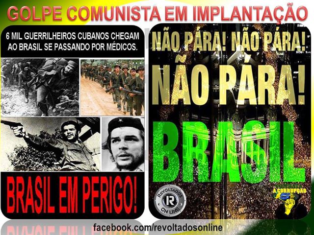 Apresentado como “a voz que emergiu das ruas”, Maycon é exposto como líder de uma comunidade no Facebook , a União Contra a Corrupção, onde se publica ou republica coisas como essa imagem aí do lado, dizendo que os médicos cubanos (cadê?) são guerrilheiros disfarçados e que um golpe comunista está em marcha. É mentira, a página é mantida por Marcello Cristiano Reis, um advogado paulista.