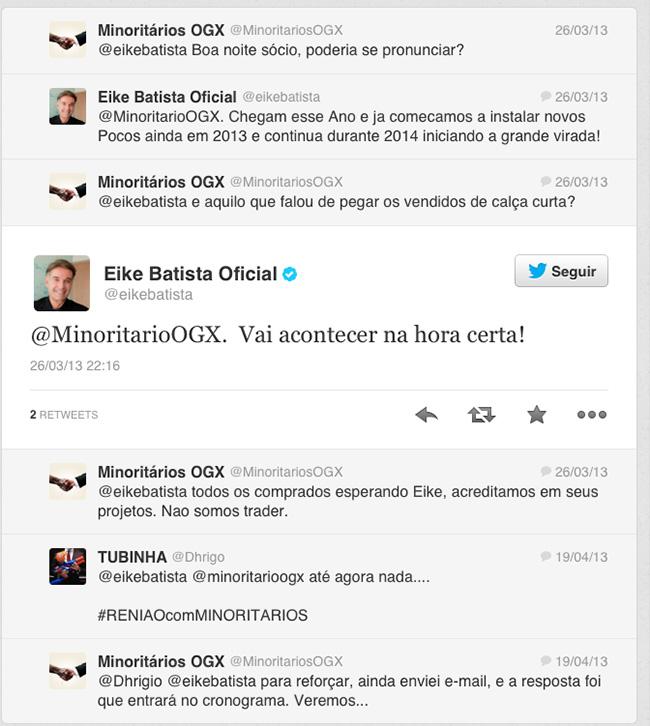 No dia 23 de março deste ano, quando as ações da OGX ainda tinham algum valor, cotadas então a R$ 3,00, Eike respondeu a uma indagação do perfil @MinoritariosOGX  com afirmativas de mais investimentos, novos poços de petróleo e “uma grande virada!” em 2014, quando mais ainda a companhia perfuraria. Nesta semana, porém, a OGX emitiu comunicado ao mercado informando o fechamento de seus poços, suspendendo perfurações sem ter encontrado petróleo em escala viável comercialmente.