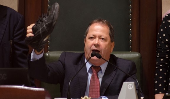 Vereador Chiquinho Brazão (PMDB) mostra sapato arremessado por manifestantes durante CPI dos Ônibus (Foto / Agência Estado)