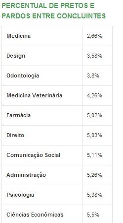 Apesar de formarem 50,7% da população brasileira, os autodeclarados negros ainda são minoria entre os formados no ensino superior. Na carreira de medicina, apenas 2,66% dos concluintes em 2010 eram pardos ou pretos. O estudo foi feito pelo Inep (Instituto Nacional de Estudos e Pesquisas Educacionais).