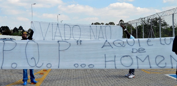 As faixas estendidas pelos torcedores no estacionamento da imprensa diziam “Viado [sic] não”, “Vai beijar a P.Q.P.” e “Aqui é lugar de homem”.
