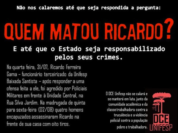 DCE da Unifesp denuncia que assassinato de Ricardo Ferreira Gama, funcionário da universidade, pode ter sido retaliação da PM por discussão ocorrida dias antes