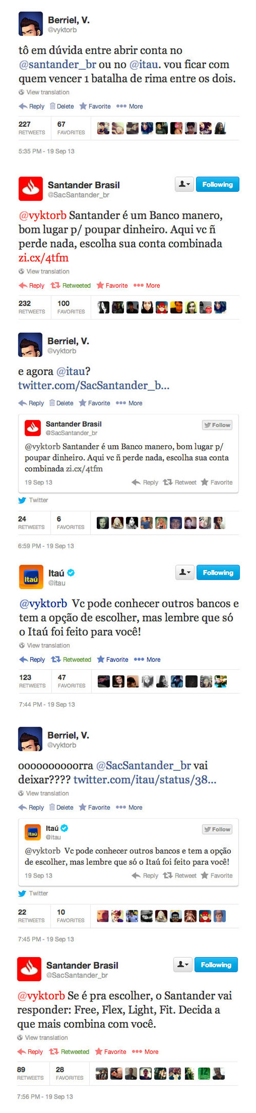 “Santander é um Banco manero, bom lugar p/ poupar dinheiro. Aqui vc não perde nada, escolha sua conta combinada”, começou o Santander. “Você pode conhecer outros bancos e tem a opção de escolher, mas lembre que só o Itaú foi feito para você”, respondeu a outra instituição bancária. Na “tréplica”, o Santander afirmou no microblog. “Se é pra escolher, o Santander vai responder: Free, Flex, Light, Fit. Decida a que mais combina com você”.