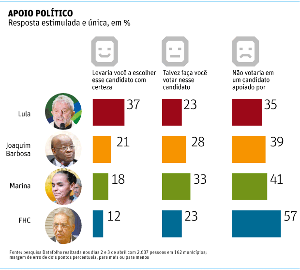 Com relação ao índice de rejeição ao candidato que apoia, Lula teria 35%, Barbosa 39%, Marina 41% e FHC 57%.