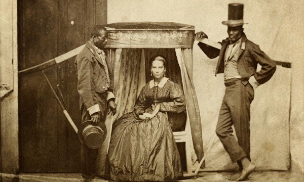Senhora na liteira (uma espécie de “cadeira portátil”) com dois escravos, Bahia, 1860 (Acervo Instituto Moreira Salles).