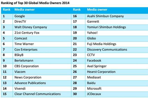 No último ano, a empresa alcançou o faturamento de US$ 37,9 bilhões, com folga do o segundo lugar, a DirecTV, que arrecadou US$ 27,2 bilhões. O Top Thirty Global Media Owners, lançado em 2007, é um ranking único que classifica os grupos de mídia de acordo com sua receita anual, considerando verbas de anúncios e publicidade.