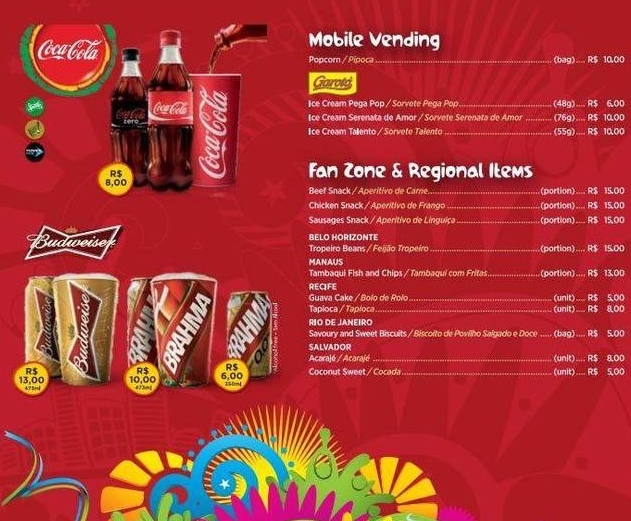 Todos os preços foram reajustados em relação ao cobrado na Copa das Confederações, no ano passado. O produto mais barato será uma garrafa de água mineral, que vai custar R$ 6.
