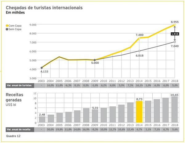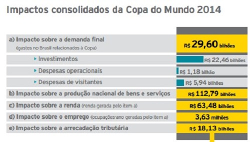 Segundo um estudo da Ernst & Young, em parceria com a Fundação Getúlio Vargas, a receita agregada à economia brasileira, de 2010 a 2014, com a realização da Copa, deve ficar em mais de R$ 142 bilhões.