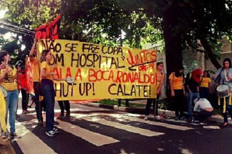 Com palavras de ordem “ô Ronaldo, preste atenção, povo não quer estádio, quer saúde e educação”, os manifestantes do coletivo “Juntos!” fizeram intervenções com tinta no asfalto e na calçada contra o ex-jogador e o evento da Fifa. O escracho também criticou a declaração do ex-atleta, que afirmou que a Copa não se fazia com hospitais. Para os jovens, a resposta busca criminalizar e ridicularizar a atuação de movimentos sociais que pedem investimentos do governo federal em serviços públicos e obras de infraestrutura.