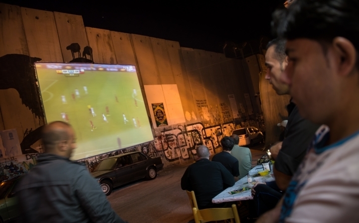 Do alto de seus oito metros de comprimento, o muro simboliza a segregação. Ao separar os palestinos da cidade sagrada de Belém do resto da Cisjordânia, tornou-se um dos emblemas da ocupação israelense dos territórios árabes. Além de servir de tela para artistas como Banksy expressarem sua indignação e ativistas rabiscarem suas palavras de ordem, a população palestina encontrou outra maneira de se apropriar dessa barreira imposta por Israel há mais de dez anos: projetar nela as partidas da Copa do Mundo, evento esportivo que congrega 32 nações diferentes e cujo slogan oficial — “juntos num só ritmo” — é mais uma provocação à construção do paredão.