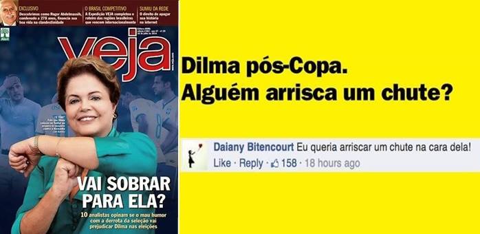 O descaramento de Veja, no entanto, vai além. Ao promover sua capa desta semana no Facebook, a publicação sugere que leitores deem pontapés em Dilma, ao perguntar “Alguém arrisca um chute?” sobre o que acontecerá com Dilma no pós-Copa. A primeira resposta, da leitora Daiany Bitencourt, é emblemática: “eu queria arriscar um chute na cara dela” – um sinal de que a sutileza de Veja foi bem compreendida por seus leitores.