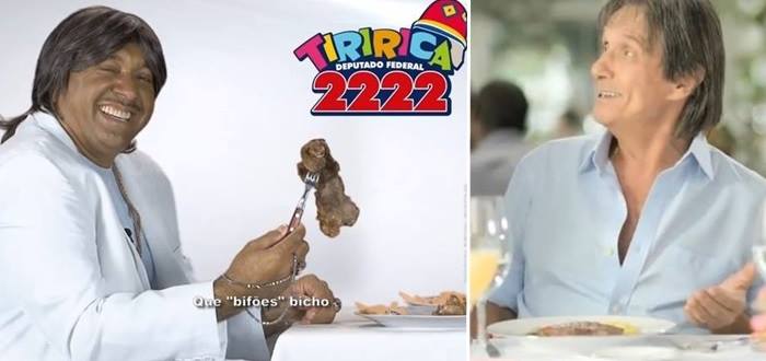 No vídeo divulgado na TV nesta semana, Tiririca aparece vestido Roberto Carlos e canta: “Eu votei, de novo vou votar. Tiririca, Brasília é seu lugar” (com a melodia da música “O portão”). Na propaganda eleitoral, Tiririca está sentado em uma mesa de refeição e mostra um bife, em referência ao comercial da empresa Friboi, que foi estrelado por Roberto Carlos. “Que bifões, bicho”, diz o comediante e político.
