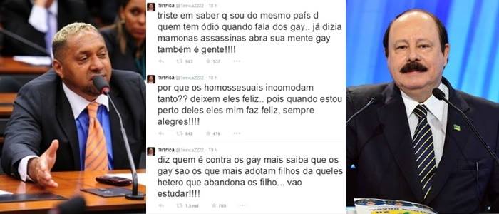 Tiririca disse se sentir feliz na presença dos homossexuais e que não compreende porque ainda há preconceito em relação à orientação sexual em pleno século 21. “Por que os homossesuais incomodam tanto?? deixem eles feliz.. pois quando estou perto deles eles mim faz feliz, sempre alegres!!!!”, escreveu. “Saiba que os gay sao os que mais adotam filhos daqueles hetero que abandona os filho… vao estudar!!!!”
