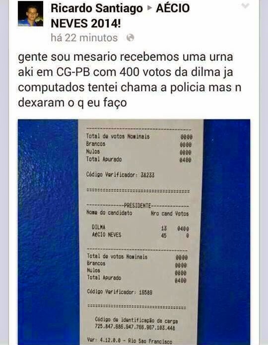 Um dos casos citados da fraude nas eleições amplamente repercutidas nas redes sociais foi o de um suposto mesário de Campina Grande chamado Ricardo Santiago, que publicou no Facebook uma foto de um Boletim de Urna “provando” que a urna de sua seção já estava com 400 votos a favor do PT antes do início da votação.