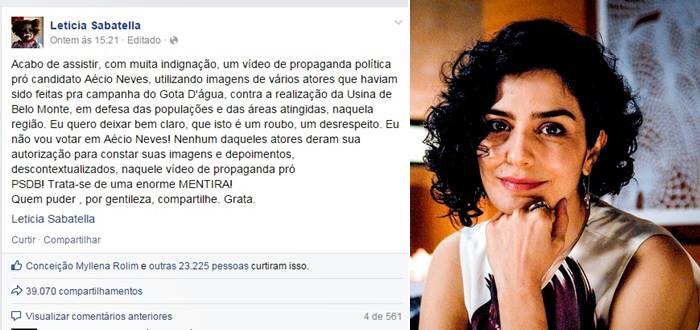“Acabo de assistir, com muita indignação, um vídeo de propaganda política pró candidato Aécio Neves, utilizando imagens de vários atores que haviam sido feitas pra campanha do Gota D’água, contra a realização da Usina de Belo Monte, em defesa das populações e das áreas atingidas, naquela região. Eu quero deixar bem claro, que isto é um roubo, um desrespeito. EU NÃO VOU VOTAR EM AÉCIO NEVES! Nenhum daqueles atores deram sua autorização para constar suas imagens e depoimentos, descontextualizados, naquele vídeo de propaganda pró PSDB! Trata-se de uma enorme MENTIRA! Quem puder , por gentileza, compartilhe. Grata.Leticia Sabatella”