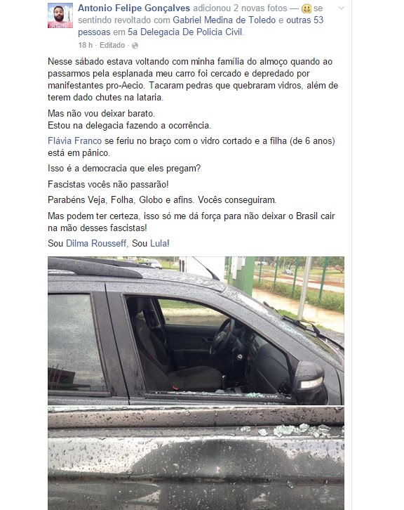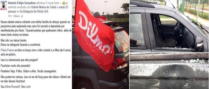 No início da tarde do último sábado (1), Antonio Felipe Gonçalves, eleitor de Dilma Rousseff (PT), teve o carro depredado quando passava por uma manifestação pró-Aécio, na Esplanada dos Ministérios, em Brasília. Segundo o jornal Correio Brasiliense, a manifestação foi convocada naquela cidade pelo advogado Matheus Sathler, candidato a deputado distrital pelo PSDB.