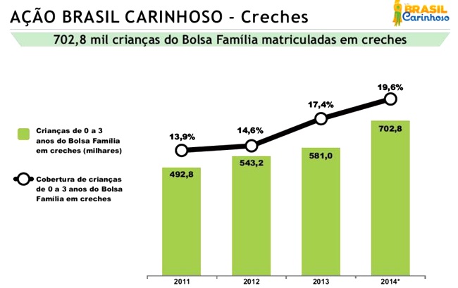O Brasil Carinhoso, estratégia central de atenção à primeira infância do Plano Brasil Sem Miséria, garantiu a presença, neste ano, de 703 mil crianças de zero a três anos do Bolsa Família em creches. Isto representa quase 20% da quantidade de meninos e meninas desta faixa etária que participam do programa de transferência de renda.