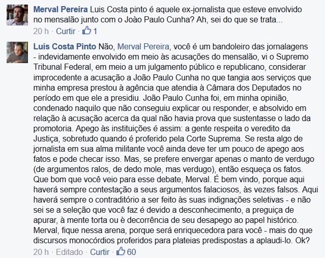 Mas o melhor momento da discussão foi quando o próprio Merval, para defender sua reputação, entrou na conversa. Ele acusou Luís Costa Pinto de envolvimento no Mensalão.