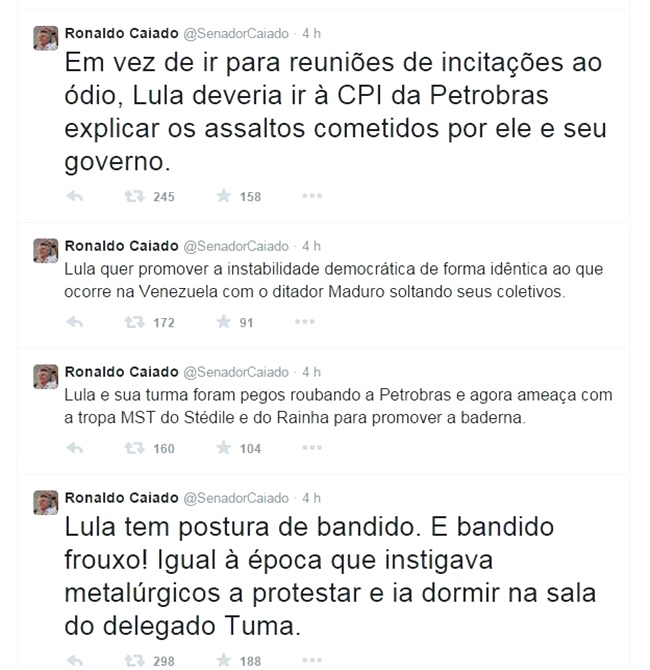 O senador goiano Ronaldo Caiado (DEM) não para de atacar o governo federal e aliados da presidente Dilma Rousseff (PT). A vítima da vez foi o ex-presidente Luiz Inácio Lula da Silva. Nas redes sociais, o parlamentar escreveu que Lula tem “postura de bandido. E de bandido frouxo“.