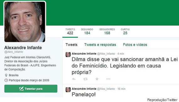 O juiz federal Alexandre Infante, de Montes Claros, Minas Gerais, publicou em seu perfil pessoal no Twitter o que considerou uma “piada” relacionando a aprovação da lei do feminicídio e a presidente Dilma Rousseff.