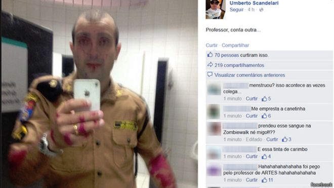 A Policia Militar do Paraná confirmou a suspeita de que as manchas vermelhas aparentes no rosto, mãos e braços do PM Umberto Scandelari eram tinta e não sangue, como ele quis aparentar em foto publicada no Facebook logo após o protesto de professores no Paraná. A imagem viralizou e foi compartilhada mais de 5 mil vezes em menos de 24 horas.