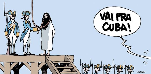 Na charge, vê-se Tiradentes com o laço da corda sendo amarrado por um dos dois soldados que o ladeiam, quando, da platéia, alguém grita: “Vai pra Cuba!”, expressão comum nas manifestações que ocorreram em todo o país tanto no dia 15 de março quanto em 12 de abril.