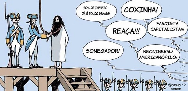 No desenho adulterado pelo MBL, é o contrário: Tiradentes é enforcado aos gritos de “coxinha”, “reaça”, “sonegador”, “fascista capitalista”, “neoliberal! Americanófilo!” e “20% de imposto já é pouco demais!”. Uma completa inversão de sentidos.