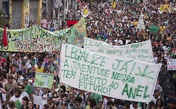 Os manifestantes apresentaram faixas e cartazes em defesa da legalização da erva e para protestar contra prisões e mortes envolvendo o combate às drogas.