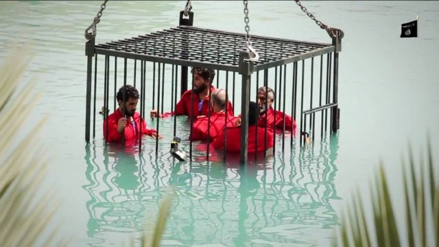 Estado Islâmico afoga espiões dentro de gaiola em piscina. Câmeras subaquáticas foram criteriosamente posicionadas para mostrar detalhes da execução bárbara