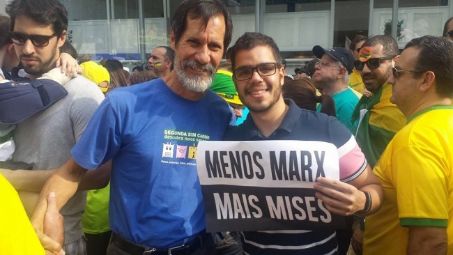 Ex-deputado federal pelo Partido dos Trabalhadores e reconhecido pelo seu ideário progressista, Eduardo Jorge foi fotografado posando ao lado de um jovem que segurava um cartaz com os seguintes dizeres: “Menos Marx, Mais Mises”.