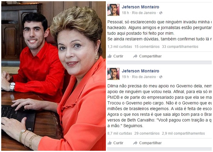 Jeferson afirma que foi traído pela petista. “A vida é feita de escolhas e ela fez a dela. Agora o que nos resta é que saia algo bom para o Brasil dali e repetir os versos de Beth Carvalho: “você pagou com traição a quem sempre lhe deu a mão”. Seguimos”, concluiu o publicitário, que ainda deixou claro que não teve a sua conta no Facebook hackeada.
