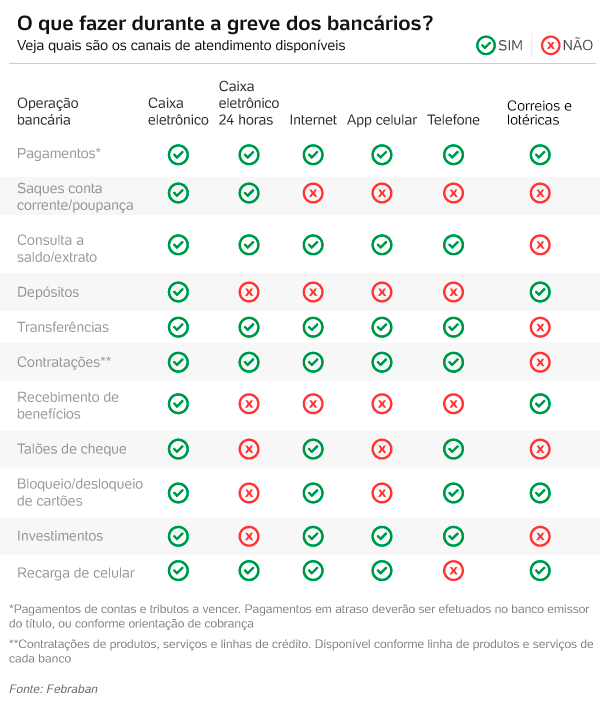 A Febraban divulgou uma lista dos serviços mais comuns e como eles poderão ser realizados durante a greve. Transferências, por exemplo, poderão ser feitas nos caixas eletrônicos, pela internet, por meio do aplicativo do banco para celular e pelo telefone. Confira a lista abaixo:
